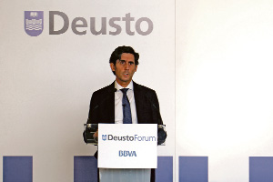 España encabeza el despliegue de fibra en Europa y sólo es superada por Japón y Corea, aseguró el presidente ejecutivo de Telefónica, José María Álvarez Pallete, en el marco de la conferencia ‘Disrupción Digital’, con la que Deusto Forum retoma su ciclo, que en esta ocasión lleva por título ‘Asomándonos a un mundo digital’. “Y todo ello se ha hecho en siete años”. Alvarez-Pallete aludió al poder de las redes y recordó que el nivel de penetración de la fibra de banda ancha es “superior al 84% en Euskadi, frente a la media del 71% en el Estado. Es, por tanto, uno de los lugares más avanzados del mundo en conectividad. Además hay un 99% de cob