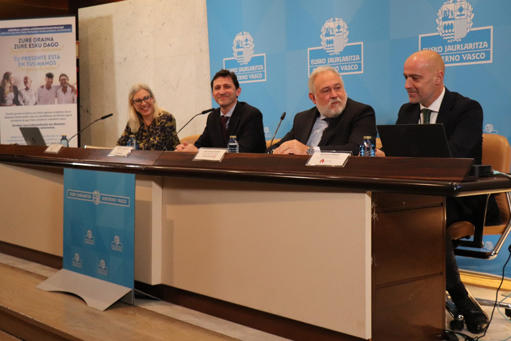El consejero de Hacienda y Finanzas, Noël d’Anjou, y los presidentes de las Cámaras de Comercio de Gipuzkoa, Mauricio Arregui; Bilbao, Jose Ignacio Zudaire; y la secretaria general de Álava, Olaia Arrieta, han presentado este miércoles la puesta en marcha de un modelo de previsión social voluntaria para personas trabajadoras autónomas a través de las EPSV.Esta iniciativa pretende propiciar una previsión social complementaria para este colectivo, que incluye a 160.000 personas, aproximadamente. Sus cotizaciones a la Seguridad Social han sido históricamente, de media, bajas y en consecuencia las pensiones que reciben (1.150,94 euros de media) s