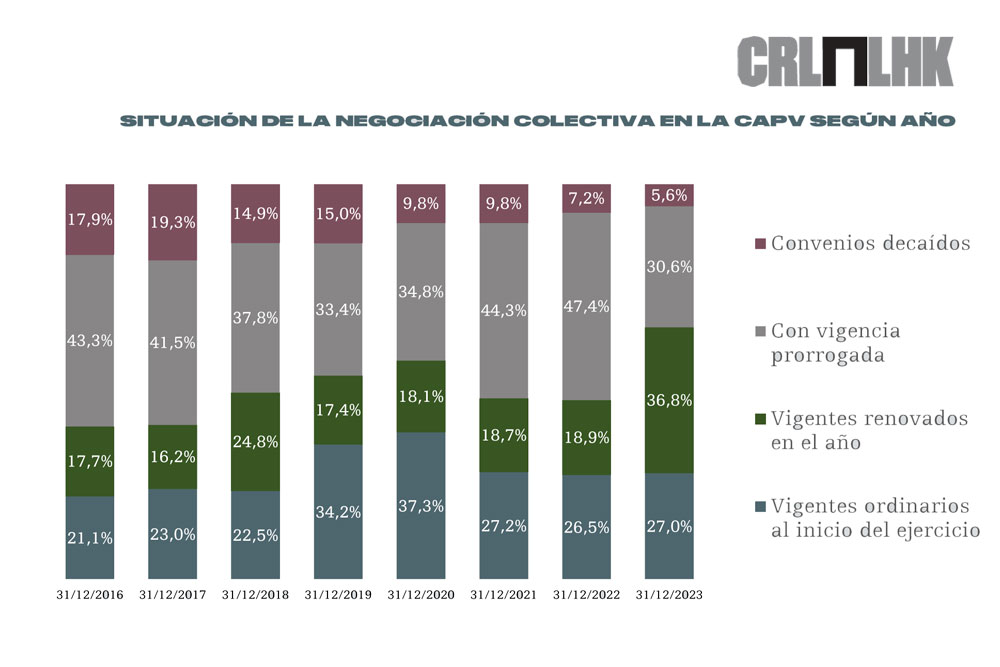 El Consejo de Relaciones Laborales a publicado un informe de la situación sociolaboral de Euskadi, correspondiente al Avance de Resultados 2023.En dicho informe se pude observar que al finalizar el 2023, el 63,8% de la población trabajadora se encontraba con sus convenios actualizados (vigencia plena), el 30,6% tenía sus acuerdos en situación de prórroga, mientras que únicamente el 5,6% se hallaba con sus convenios decaídos y sin cobertura, siendo estos los mejores datos desde la aprobación de la reforma laboral de 2012, tanto en los que se refiere al porcentaje de población trabajadora con sus convenios vigentes, como al de personas con sus