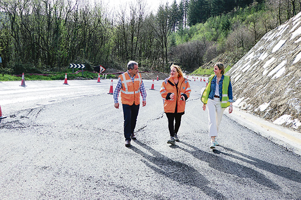 Las obras de ampliación y mejora de la carretera N-636, que une Gipuzkoa y Bizkaia a través del puerto de Kanpazar, estarán terminadas en los próximos días, según ha anunciado la diputada foral de Infraestructuras Viarias, Aintzane Oiarbide (en el centro de la imagen). Estos trabajos, que comenzaron el 1 de octubre en la zona del merendero de Sara y se han ido ejecutando en los últimos meses en sentido ascendente, mejorarán la seguridad vial, ya que se ampliará la anchura; pero, sobre todo, se evitarán las situaciones de riesgo al cruzarse vehículos pesados en ciertos puntos. Este proyecto ha contado con un presupuesto de 1,2 millones de euro
