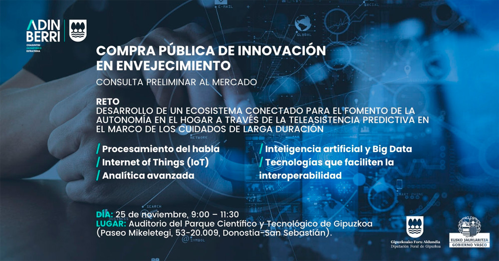 El 25 de noviembre a las 9:00 horas en el Parque Científico y Tecnológico de Gipuzkoa se presenta la Consulta Preliminar al Mercado, la primera de las fases del proceso de Compra Pública de Innovación, en relación al reto: “desarrollo de un ecosistema conectado para el fomento de la autonomía en el hogar a través de la teleasistencia predictiva en el marco de los cuidados de larga duración”.Esta consulta está dirigida a todos aquellos agentes interesados en ofrecer soluciones y tecnologías centradas en el i) procesamiento del habla, ii) Internet of Things (IoT), iii) analítica avanzada, Inteligencia Artificial y Big Data y iv) tecnologías