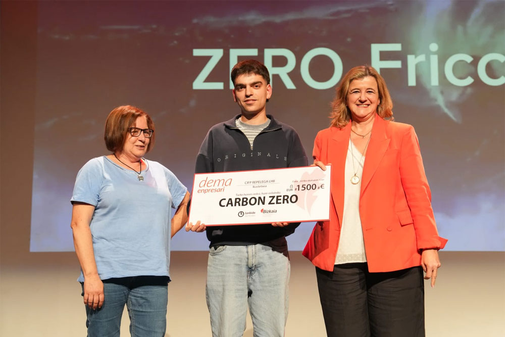 El proyecto ‘Carbón Zero’ de Iker Cruzado Rodríguez (CIFP Repelega) ha resultado ganador del concurso Enpresari de fomento de la cultura emprendedora en el ámbito de la Formación Profesional de Bizkaia. Se trata de una idea de emprendimiento para diseñar, desarrollar y fabricar piezas de fibra de carbono forjado centradas inicialmente en el mercado deportivo con aplicaciones como quillas de tablas de surf.El programa Enpresari es una iniciativa de la Agencia Foral de Empleo y Emprendimiento de Bizkaia - DEMA que cumple su XXIII edición y que ha entregado este miércoles los premios de su concurso anual de ideas emprendedoras en el marco de la
