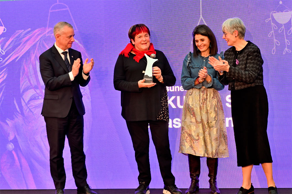 El lehendakari Iñigo Urkullu, acompañado de la consejera de Igualdad, Justicia y Políticas Sociales, Nerea Melgosa, y de la directora de Emakunde, Miren Elgarresta, ha entregado este martes el Premio Emakunde a la Igualdad a la escritora Mariasun Landa Etxebeste, por su aportación creativa a la causa de la igualdad y dignidad de las niñas, adolescentes y mujeres.El lehendakari ha querido agradecer a Mariasun Landa especialmente su obra dirigida al público infantil y juvenil, en la que ha aportado imaginarios “que les permite cuestionarse el mundo tal y como lo han conocido, hacerse nuevas preguntas, transmitirles valores y modelos de vida”.Ur