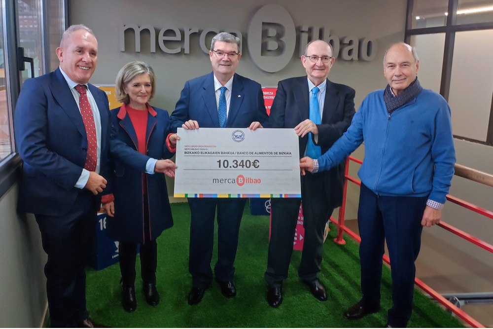 Mercabilbao ha hecho entrega al Banco de Alimentos de Bizkaia un cheque solidario con la recaudación obtenida de la venta del libro ‘50 años, 50 recetas’ que editó el mercado de abastecimiento alimentario en 2021 para conmemorar su medio siglo de vida. Este martes, el alcalde de Bilbao, Juan Mari Aburto, acompañado por el director general de Mercabilbao, Aitor Argote Ibáñez, y el concejal de Desarrollo Económico, Xabier Ochandiano, se ha reunido con el presidente de la entidad beneficiaria, Luis Crovetto, para hacerle entrega del talón con la donación de 10.340 euros, importe obtenido tras la venta de más de 2.000 ejemplares. Mercabilbao y