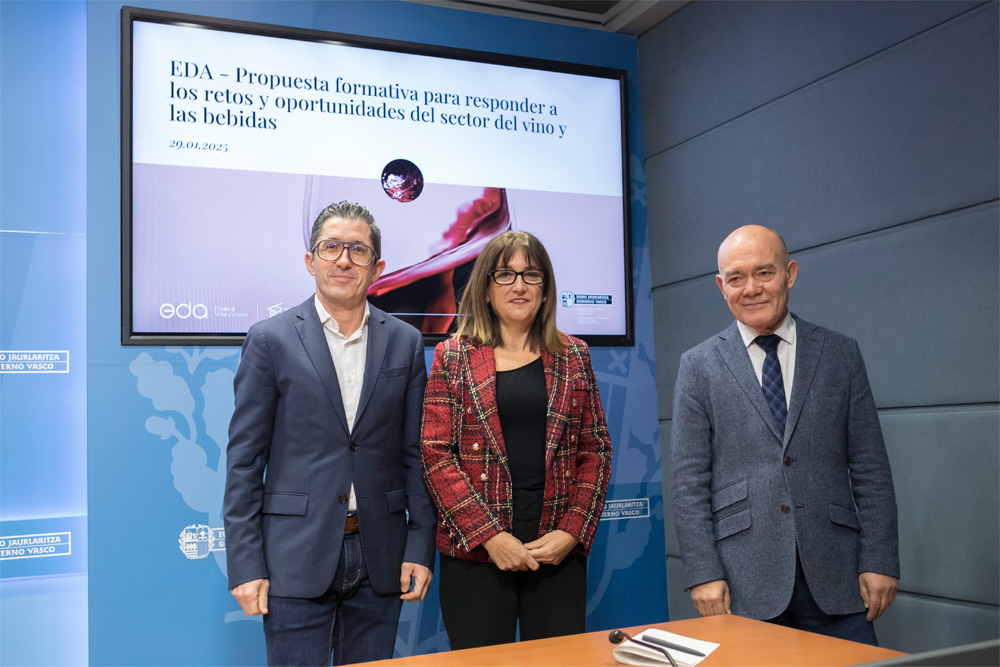 EDA Drinks & Wine Campus ya tiene definida su propuesta formativa: un grado universitario en vino y bebidas, seis másteres, dos de ellos universitarios y varios cursos de especialización, conformarán el catálogo educativo ofertado bajo el paraguas de Basque Culinary Center-Facultad de Ciencias Gastronómicas de Mondragón Unibertsitatea, en sus sedes de Vitoria-Gasteiz y Laguardia. Los consejeros de Ciencia, Universidades e Innovación, Juan Ignacio Pérez Iglesias y de Alimentación, Desarrollo Rural, Agricultura y Pesca, Amaia Barredo, han presentado este miércoles en la sede del Gobierno vasco en Lakua, junto a Joxe Mari Aizega director de Basq